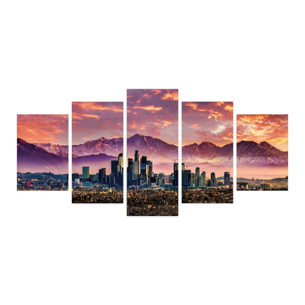 Cityscape 5 Panels Acrylic Glass Wall Art Los Angeles Skyline And Snowy Mountains Sunset Under Clouds Photo Accent For Living Room Bedroom Dorm 60 X 30 Violet Orange Dark Teal By Ambesonne